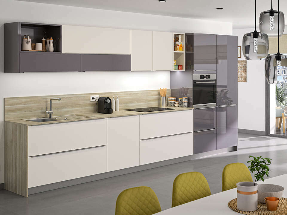 Ce qui se dégage de la cuisine Aéris / Suzy, c’est d’abord un sentiment de chaleur et de convivialité. Les coloris ''Neige Laqué Brillant'' et ''Châtaignier Nature'' se marient à la perfection. Les deux niches décoratives allègent la ligne et assurent le trait d’union avec les façades de la cuisine. L’ensemble est relevé par un plan de travail Compact ''Marmo Canova'' de 12 mm. Notre cuisine Aéris / Suzy est à la fois moderne par sa conception et plus classique par le choix de ses coloris. Elle résume à elle seule les possibilités de la marque : savoir proposer des cuisines contemporaines ou plus traditionnelles dans une vaste gamme de modèles, de coloris et de décors.